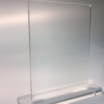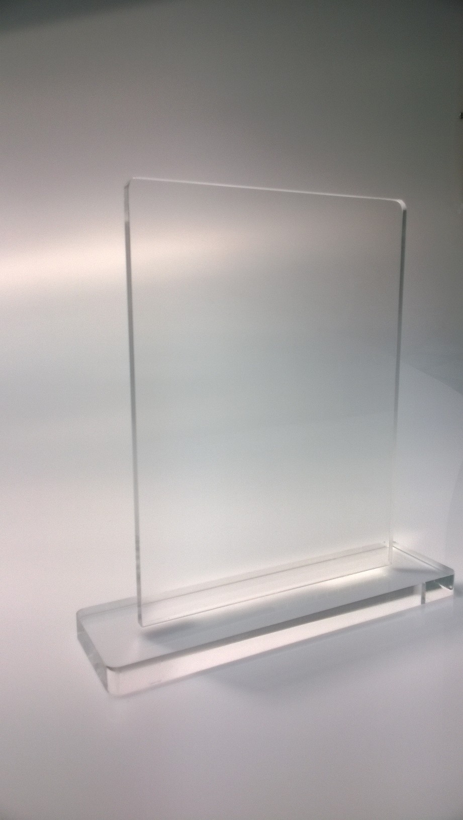 Troféu perpendicular em acrílico cristal com 5 mm de espessura. Base com cantos arredondados em acrílico cristal com 10 mm de espessura. Gravação não incluída.