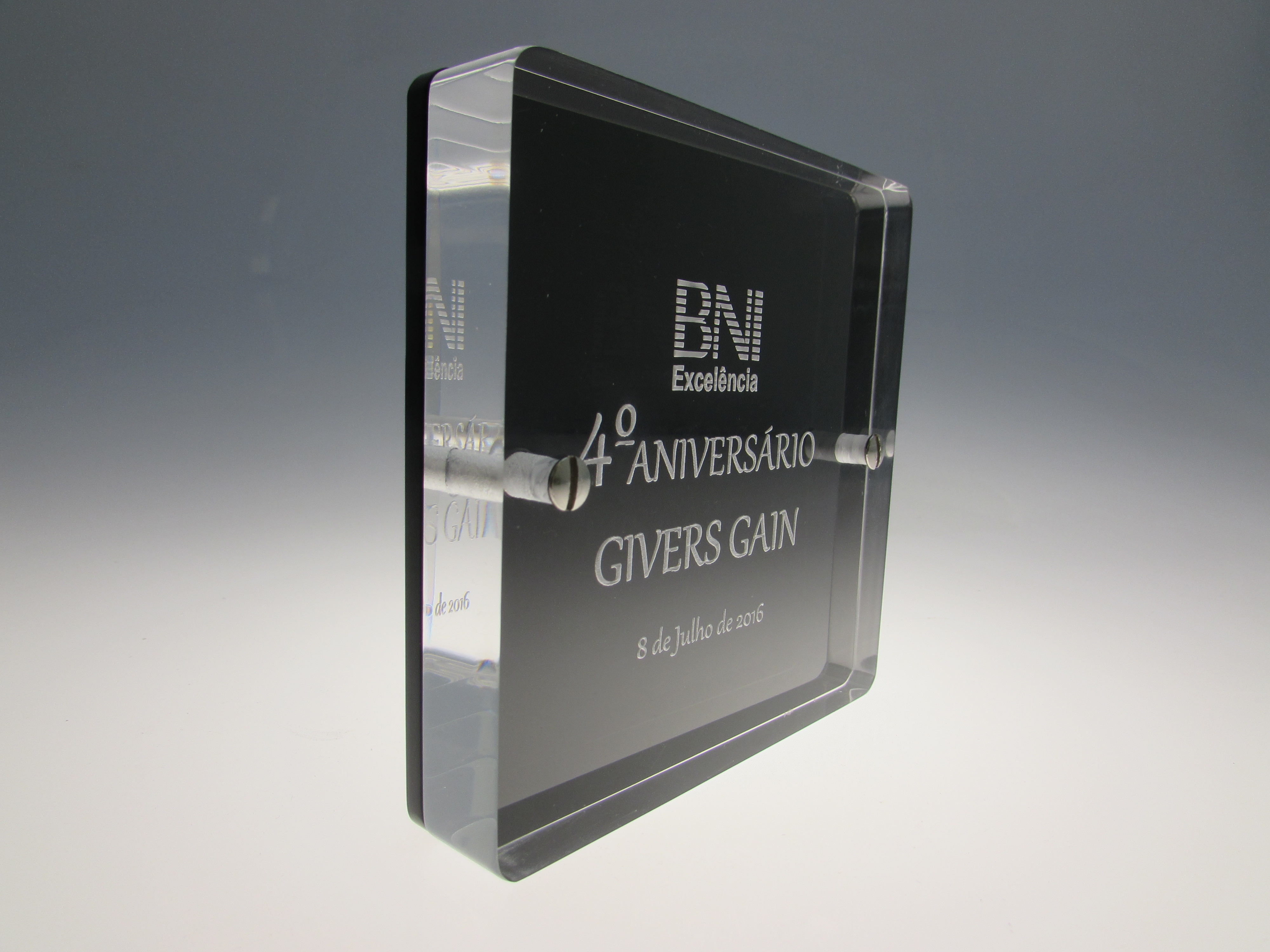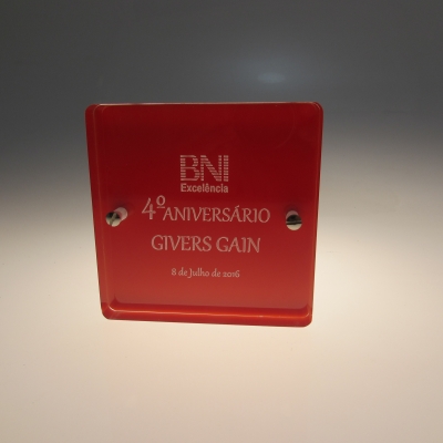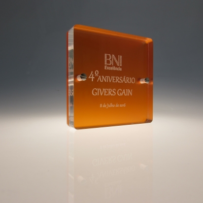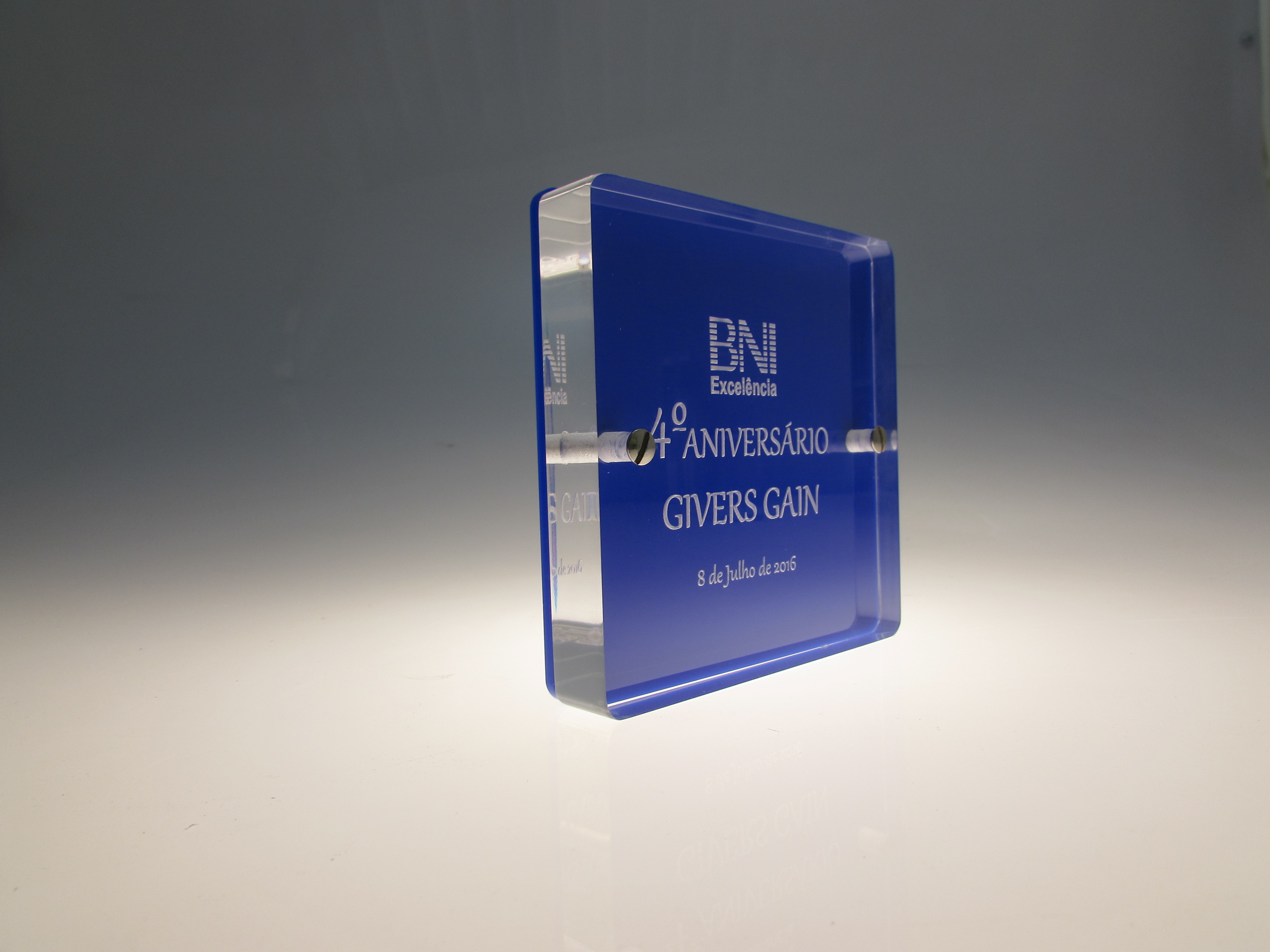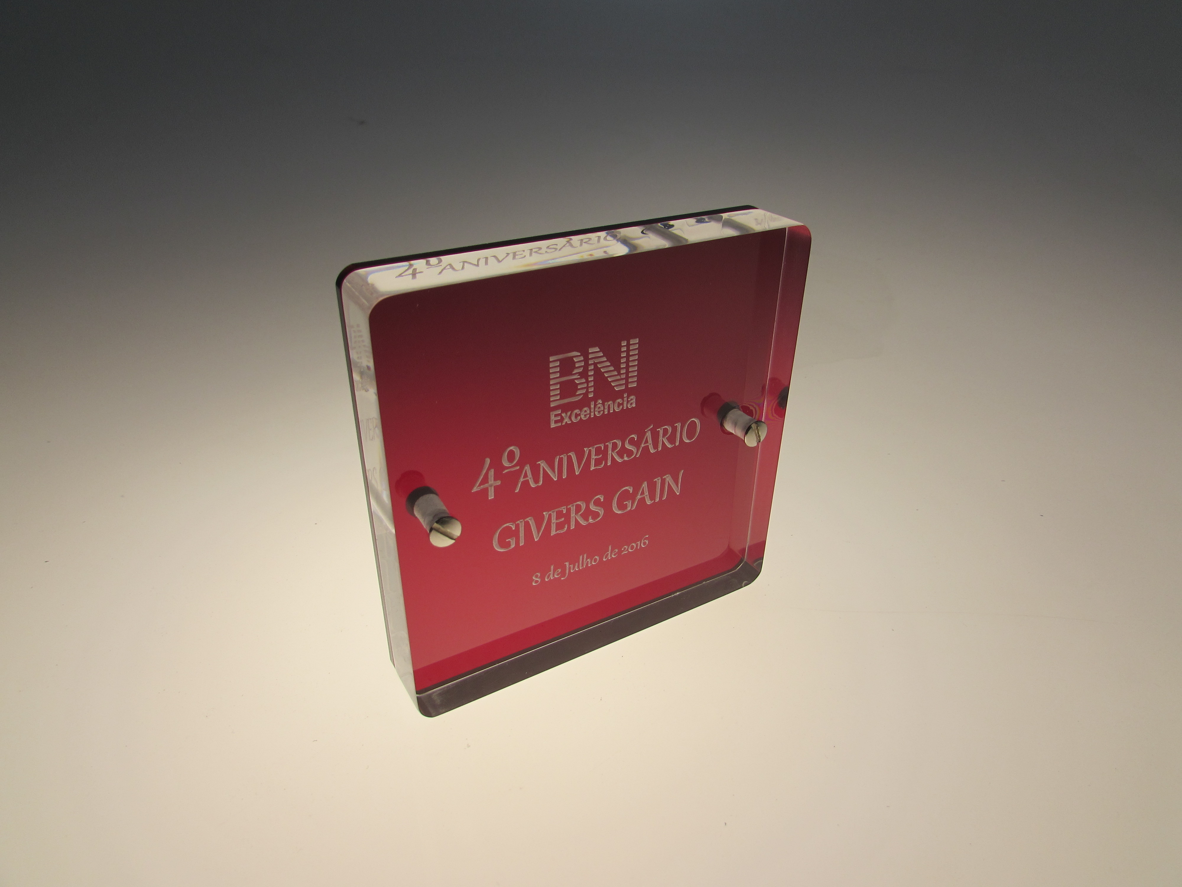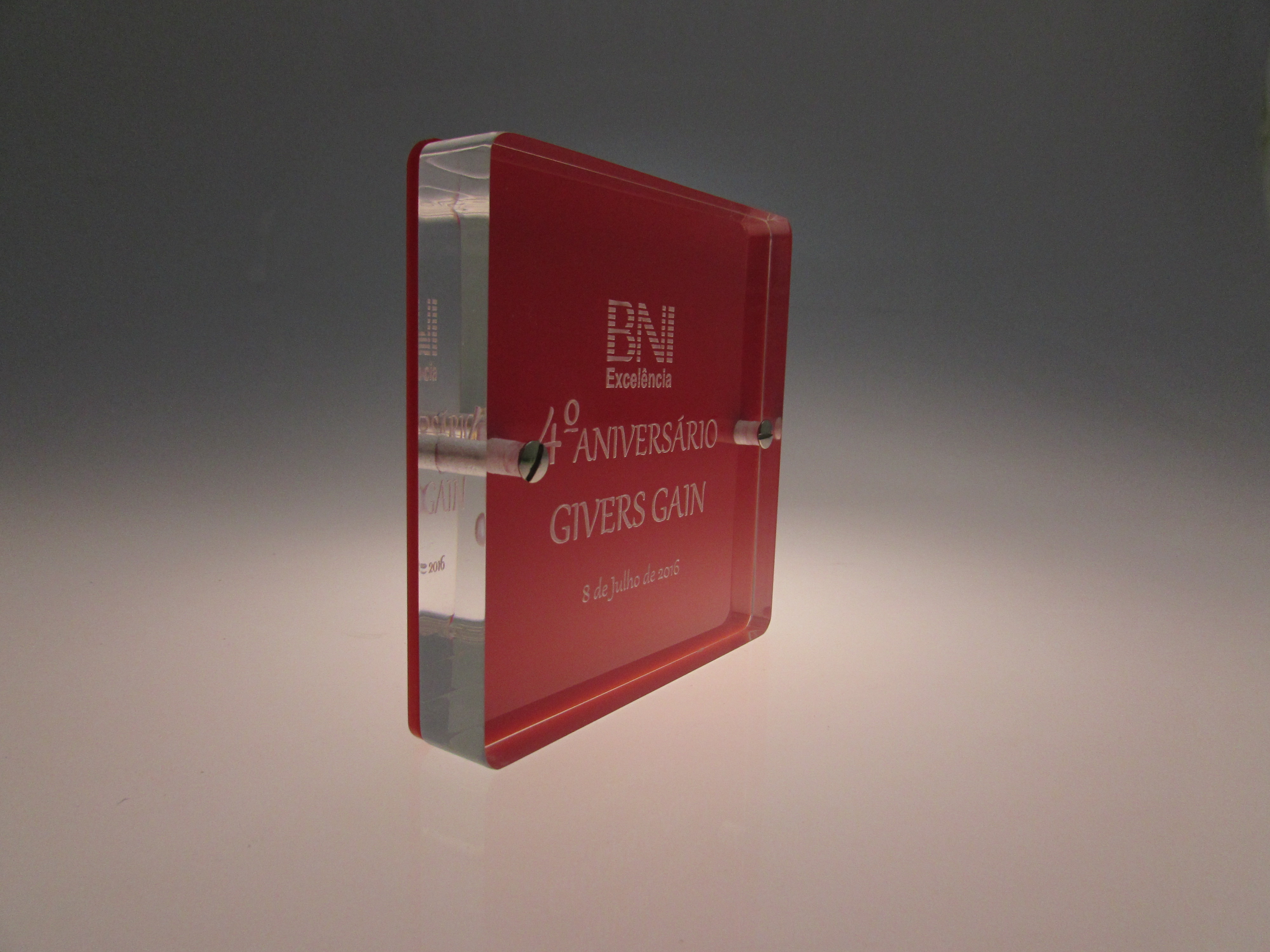 Troféu 100X100X18 mm com uma placa acrílico cristal de 15 mm e uma placa de cor de 3 mm fixas com 2 parafusos. Gravação laser incluída.
