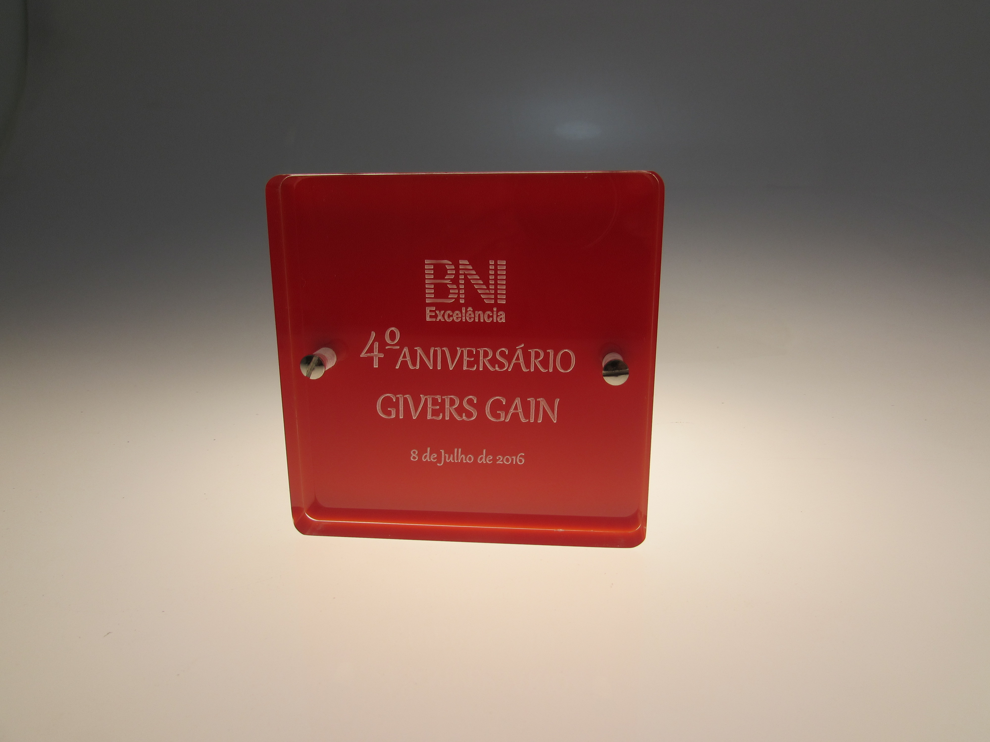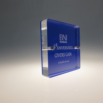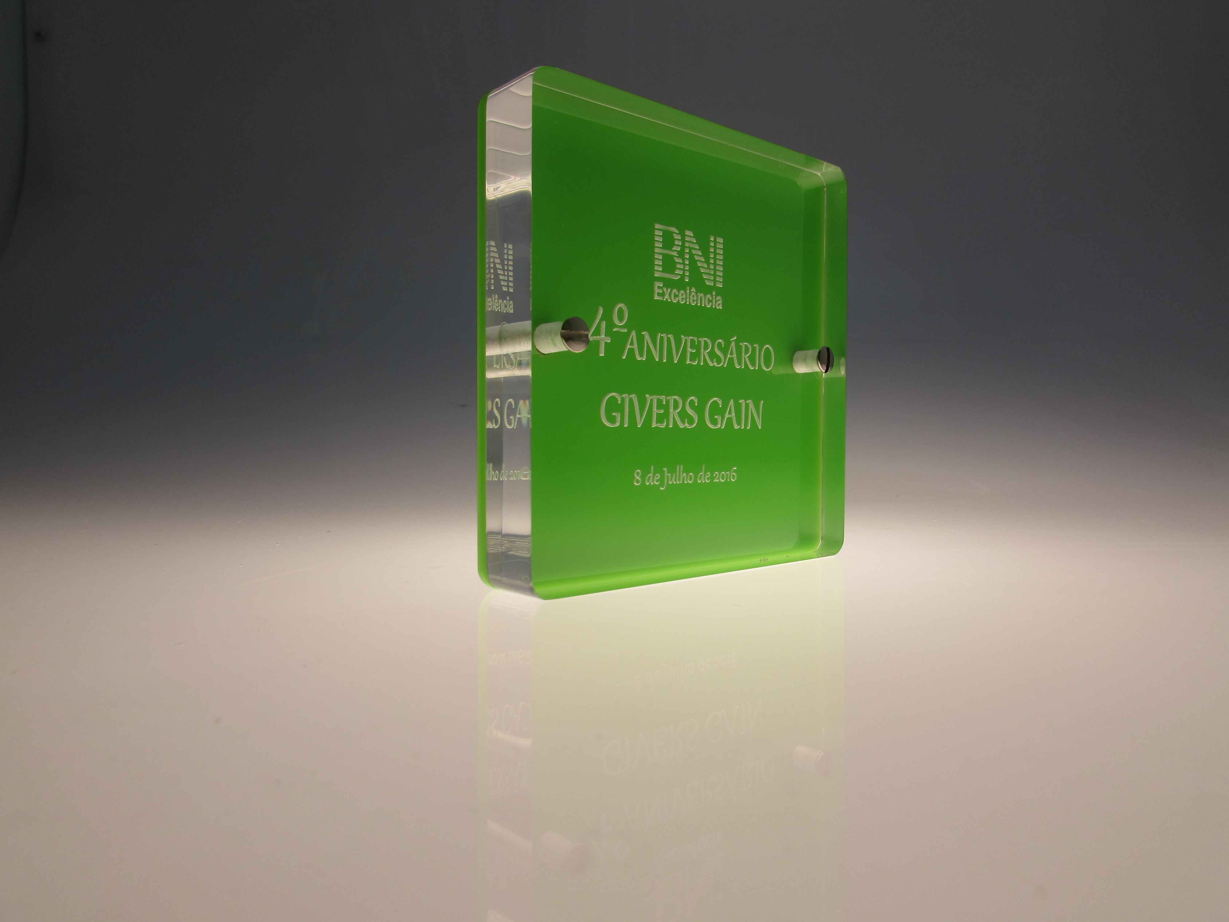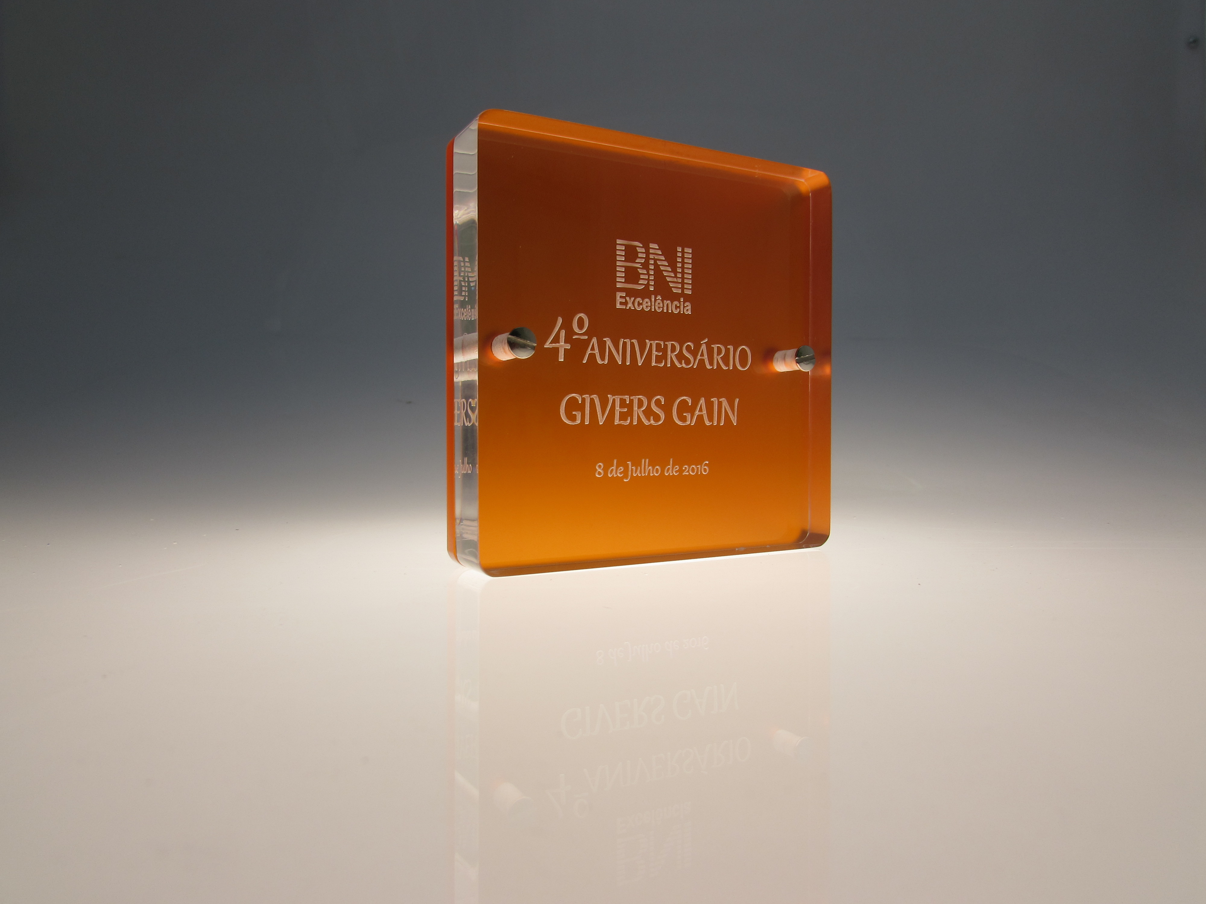 Troféu 100X100X18 mm com uma placa acrílico cristal de 15 mm e uma placa de cor de 3 mm fixas com 2 parafusos. Gravação laser incluída.