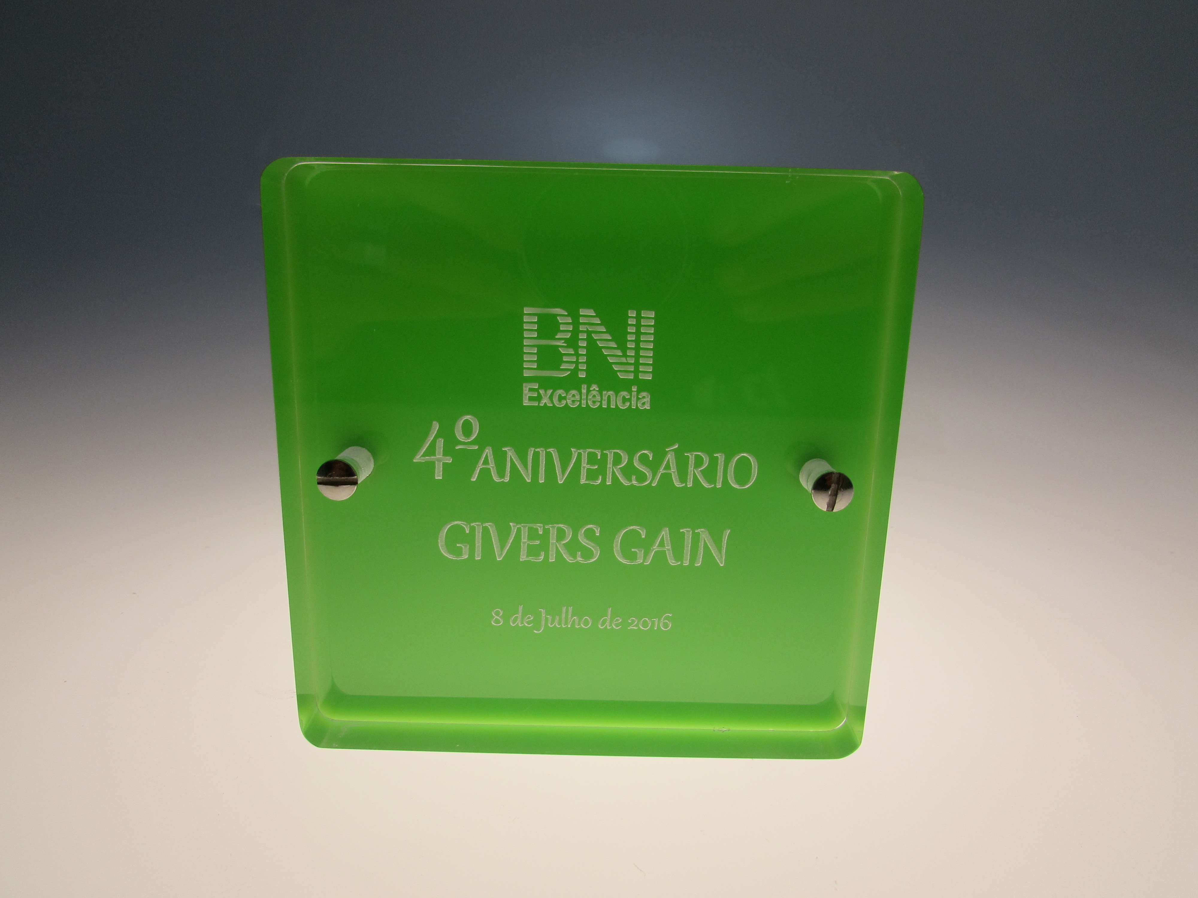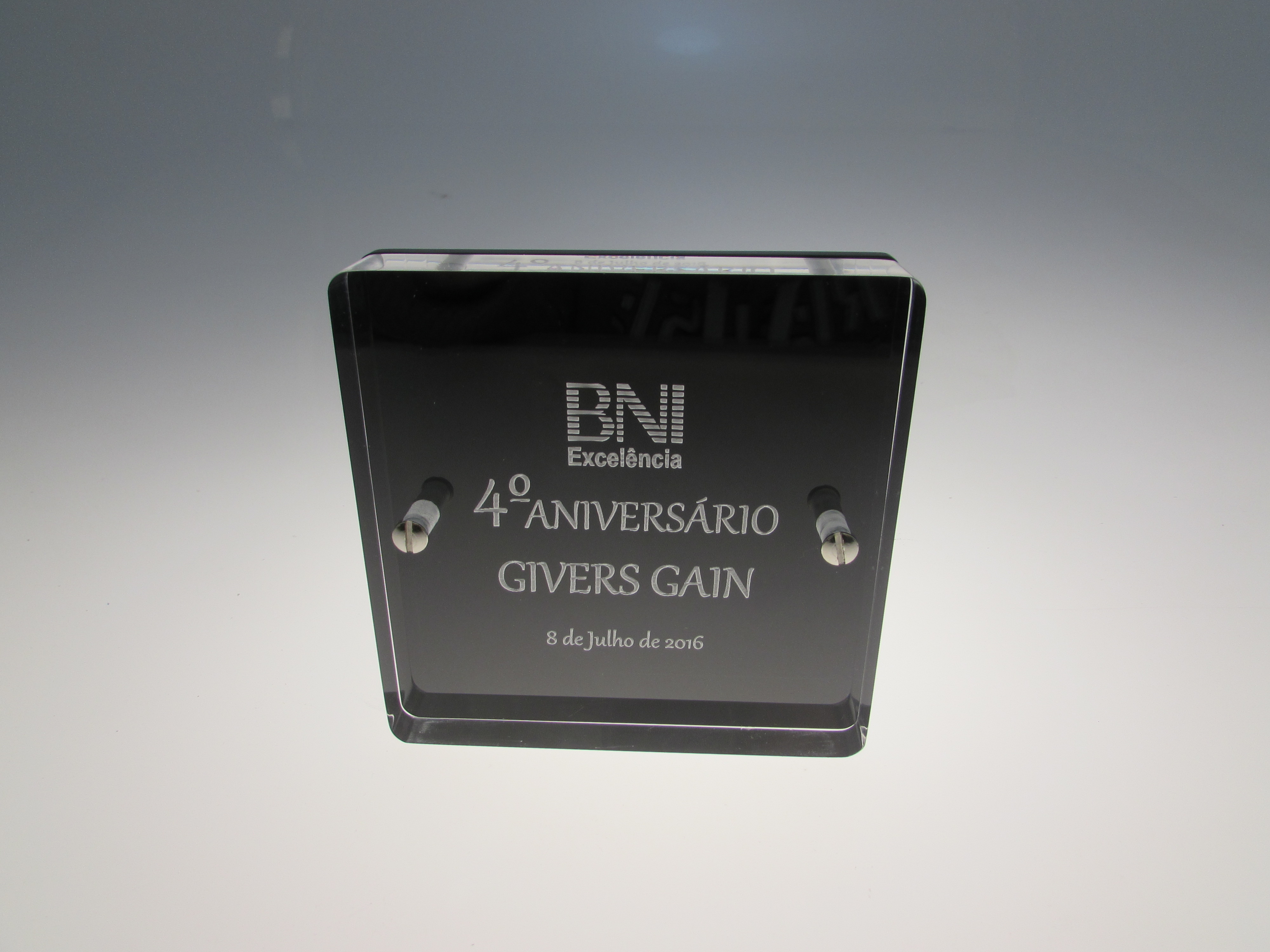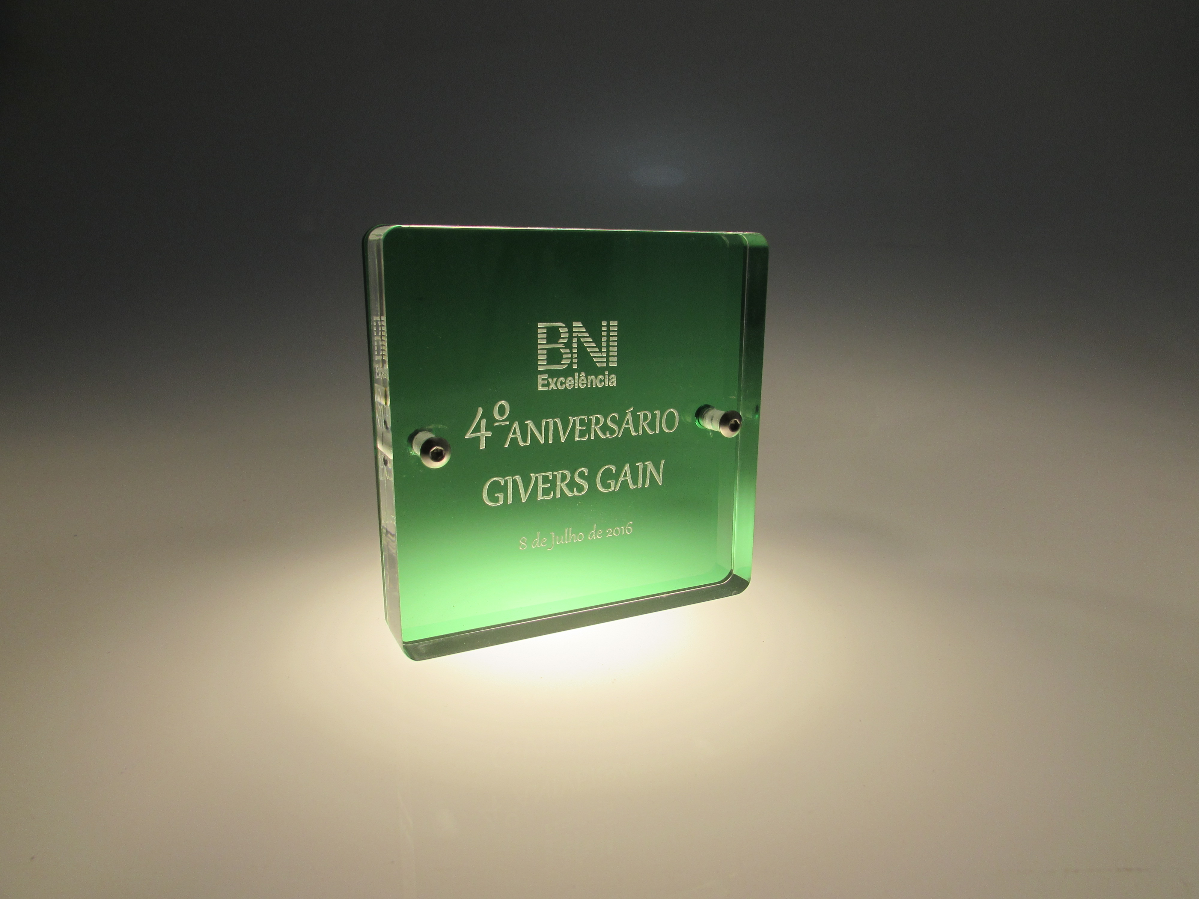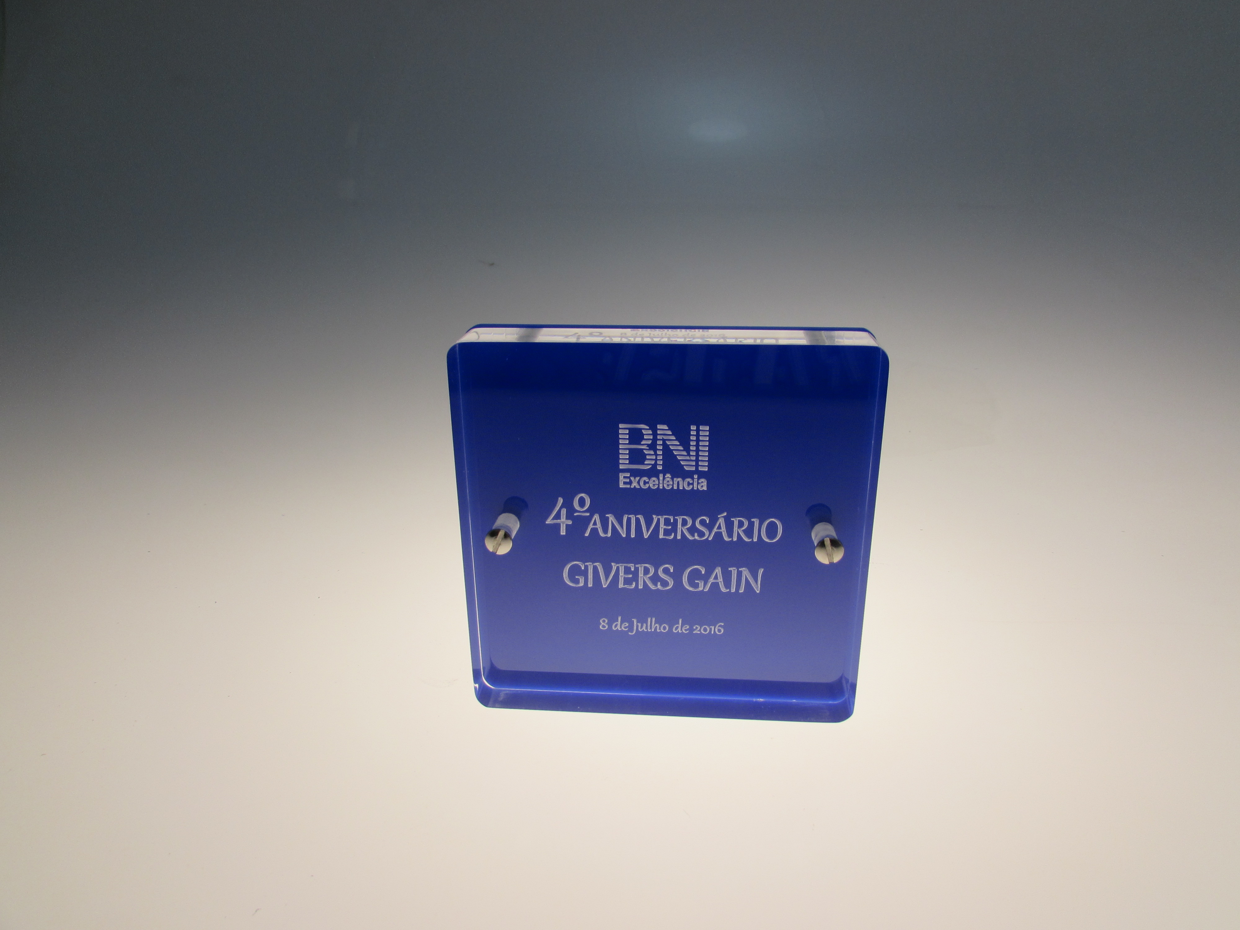 Troféu 100X100X18 mm com uma placa acrílico cristal de 15 mm e uma placa de cor de 3 mm fixas com 2 parafusos. Gravação laser incluída.