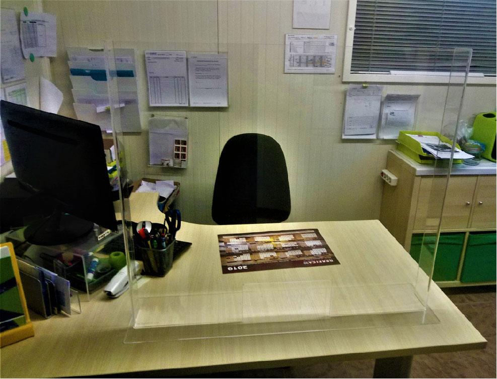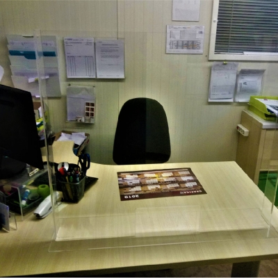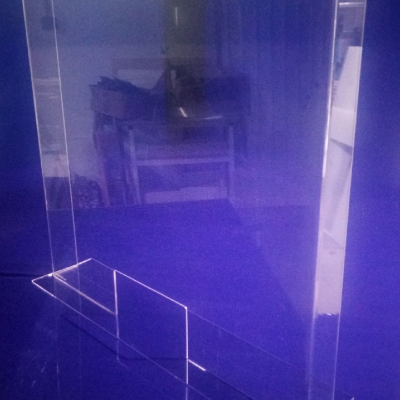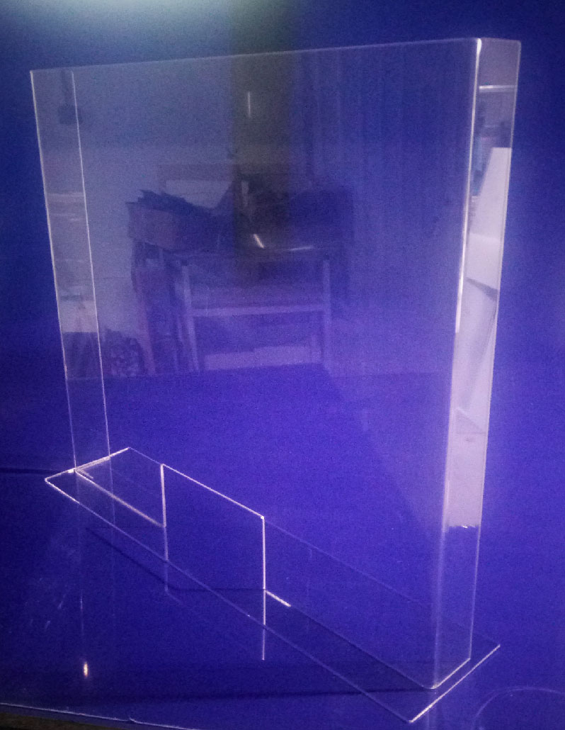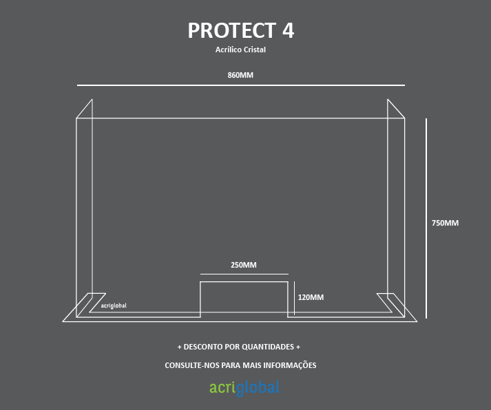 Divisória de Proteção em Acrílico Cristal para Mesa ou Balcão, com 860mm de Largura e 750mm de Altura. Base com Suporte Horizontal