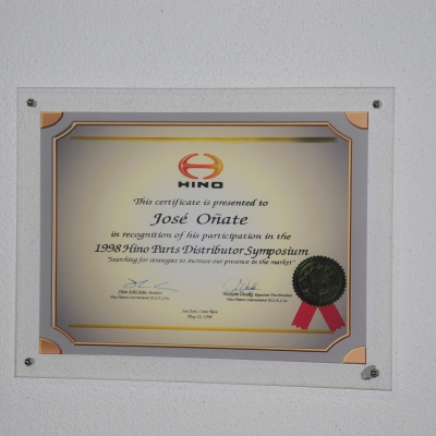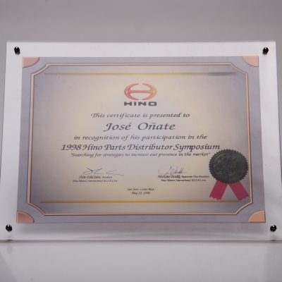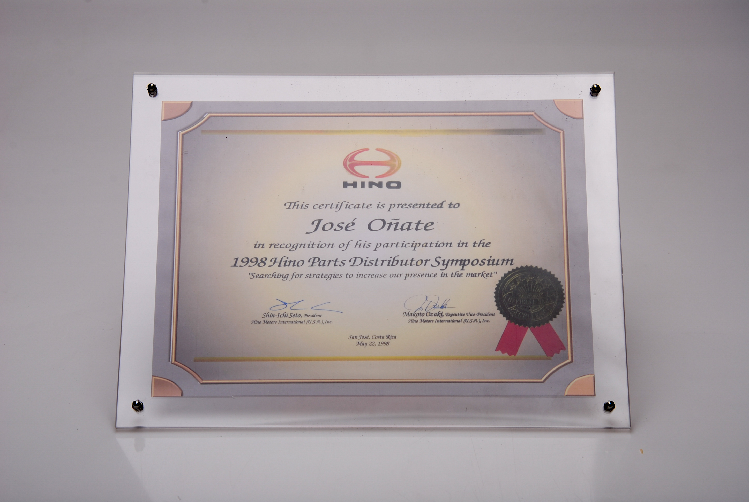 Moldura em acrílico cristal com 3 mm de espessura com parafusos a unir as duas placas e furação para fixação.
