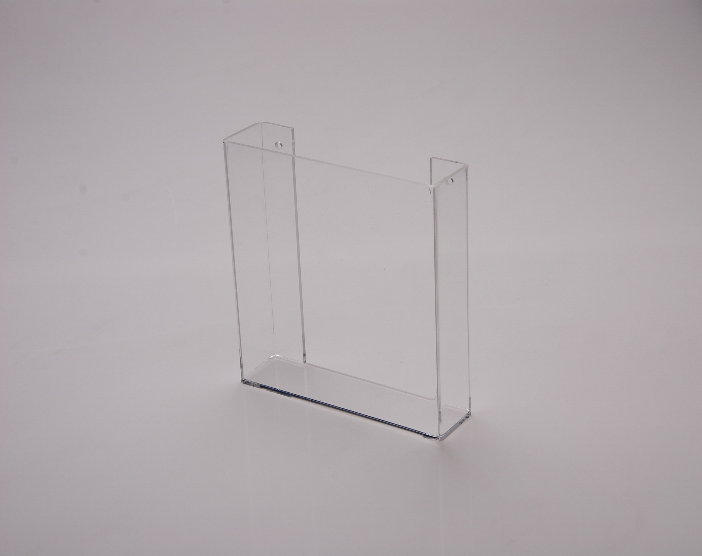 Porta folhetos em acrílico cristal com 3 mm de espessura. Com furação (2) para fixação.