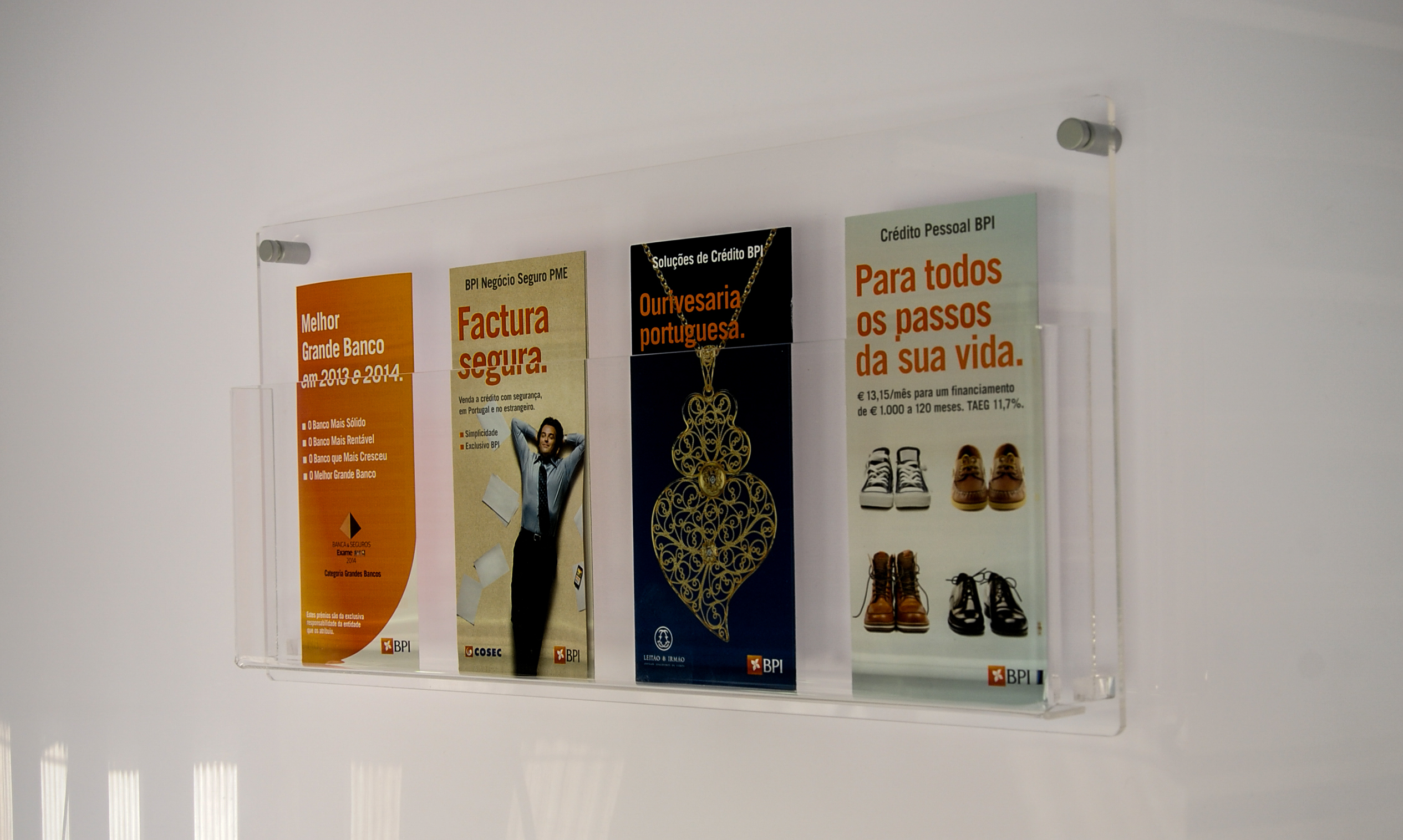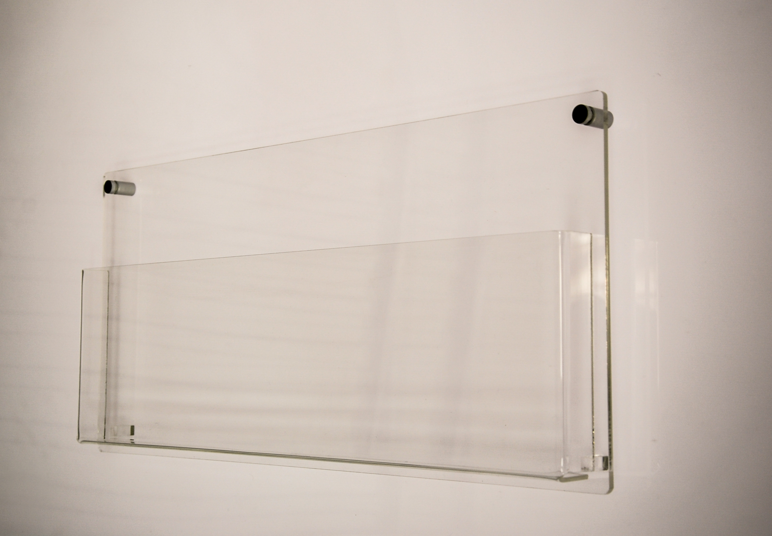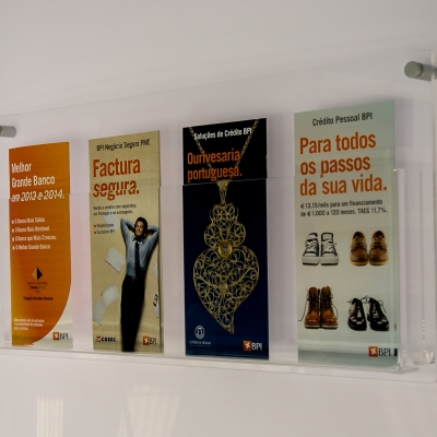 Porta folhetos em acrílico cristal com 5 e 3 mm de espessura. Afastadores em alumínio para fixação.