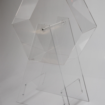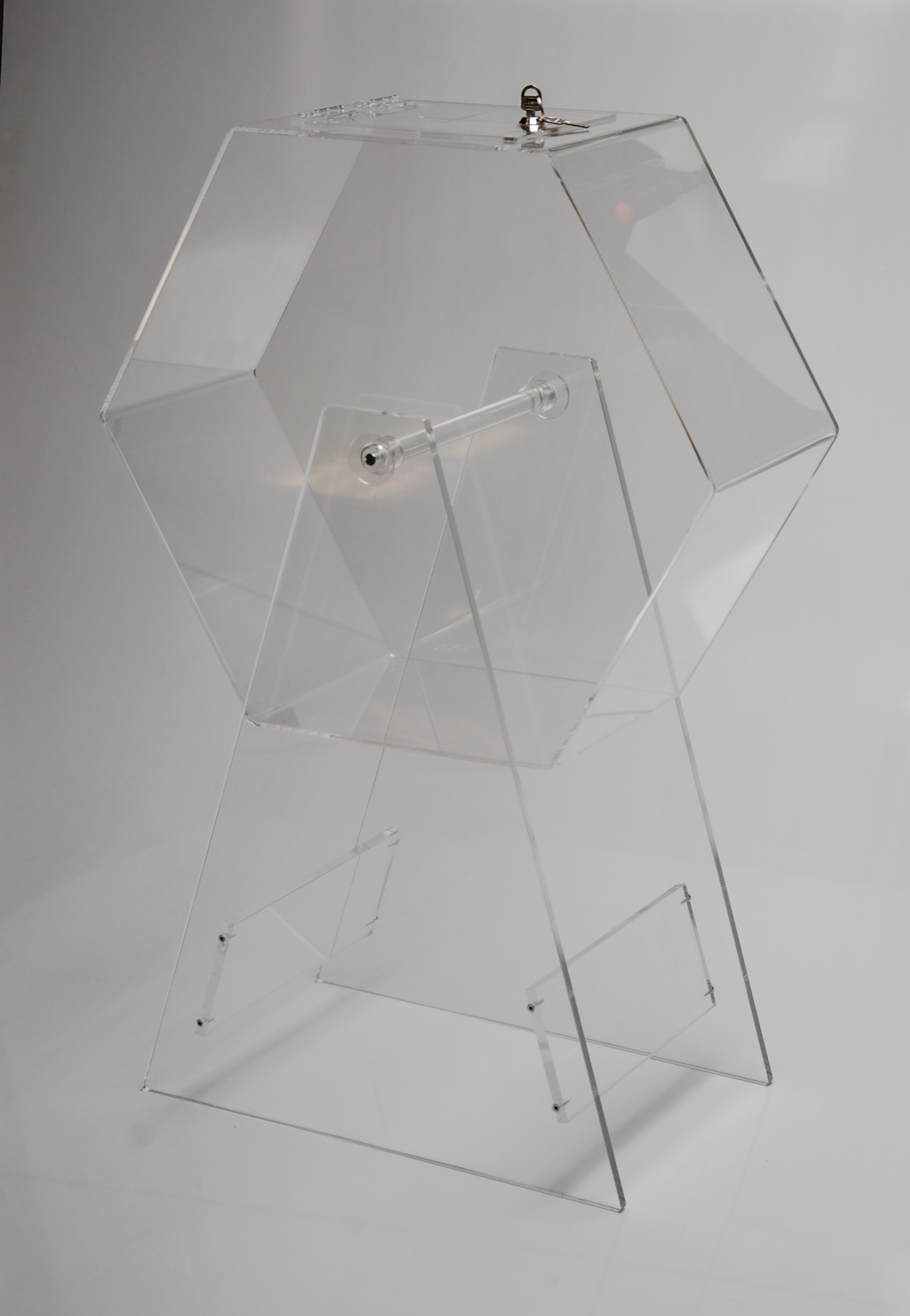 Tômbola hexagonal em acrílico cristal, base com 10 mm de espessura e tambor com 4 mm de espessura. Tambor com 600 mm de diâmetro e 250 mm de largura.