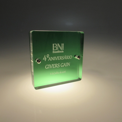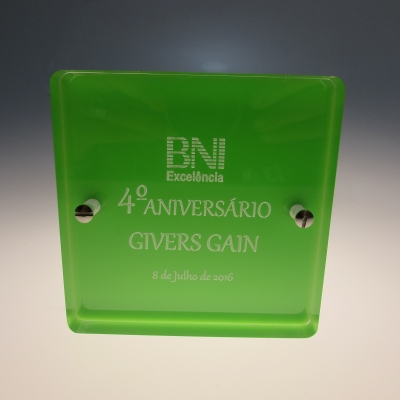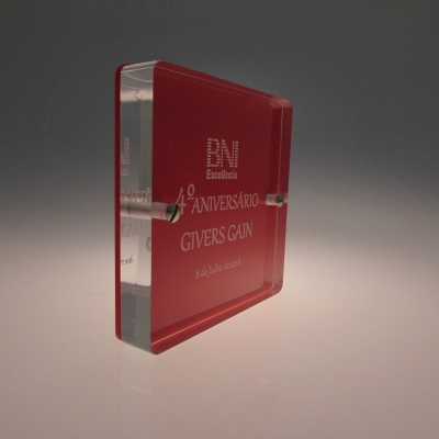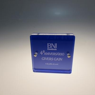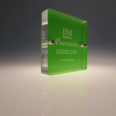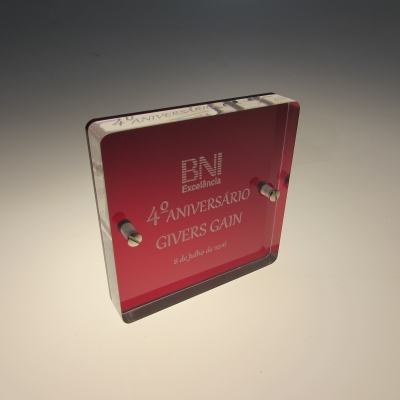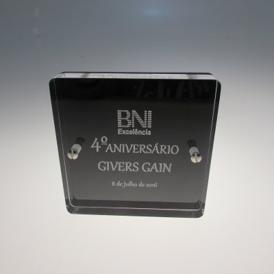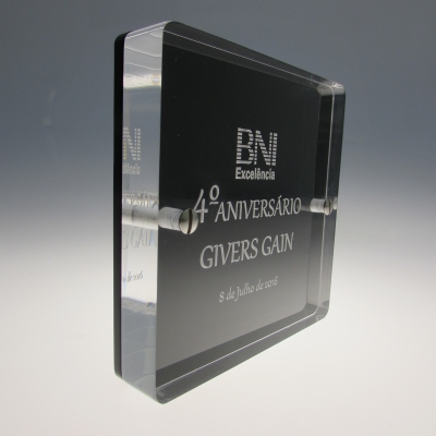 Troféu 100X100X18 mm com uma placa acrílico cristal de 15 mm e uma placa de cor de 3 mm fixas com 2 parafusos. Gravação laser incluída.