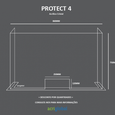 Divisória de Proteção em Acrílico Cristal para Mesa ou Balcão, com 860mm de Largura e 750mm de Altura. Base com Suporte Horizontal
