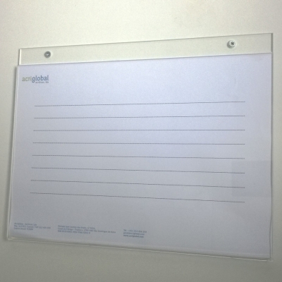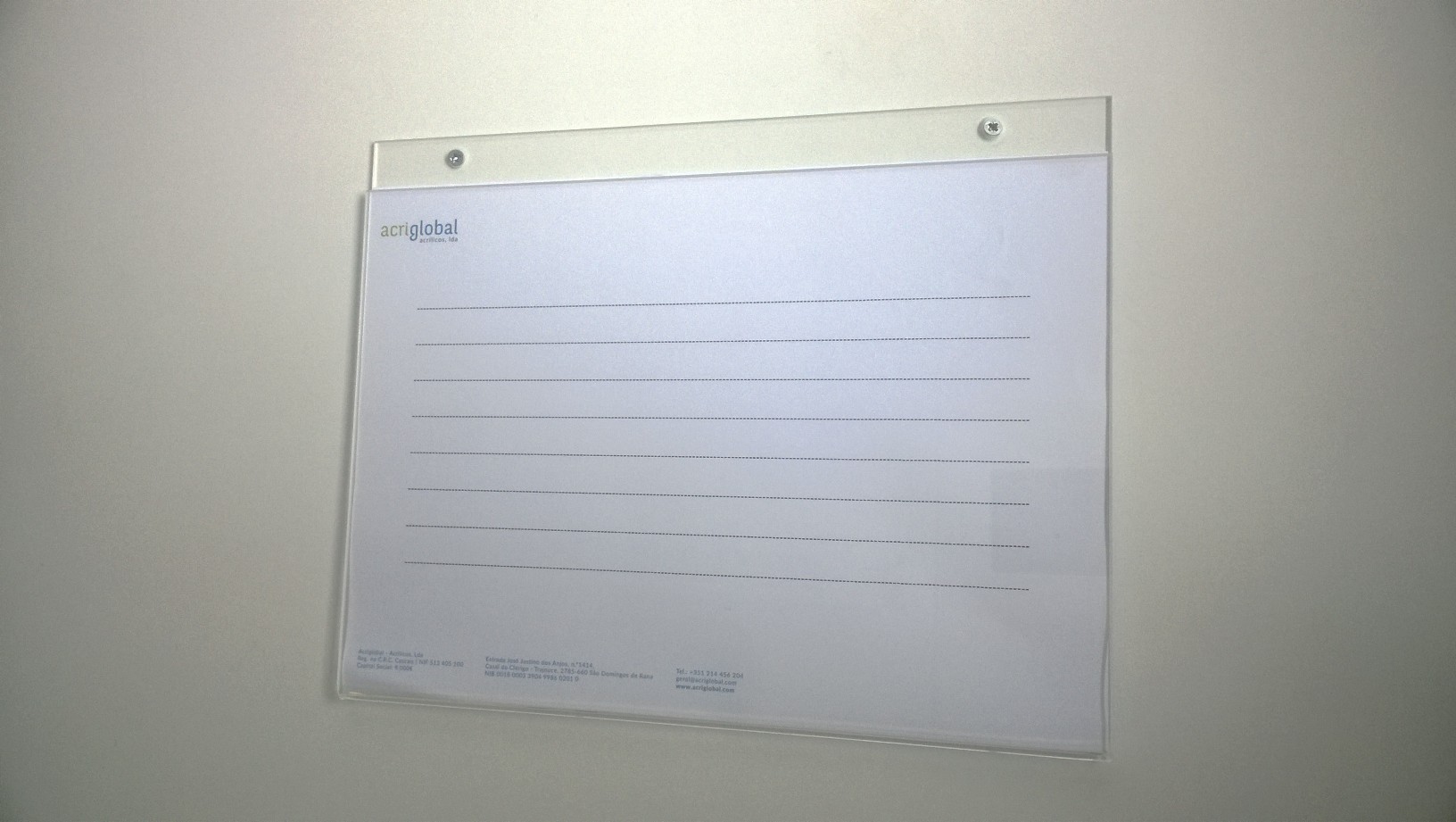 Moldura em acrílico cristal com 3 mm de espessura com aba furada para fixação.